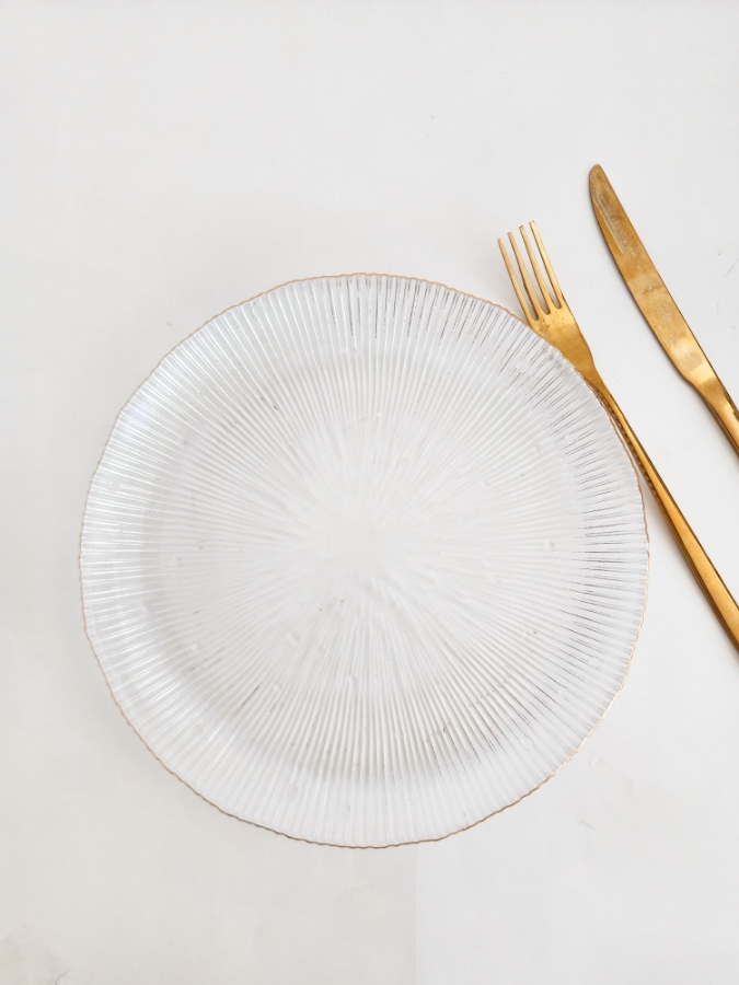 صحن مائدة شفاف زجاجي بأطراف ذهبية قطر ٢٧ سم