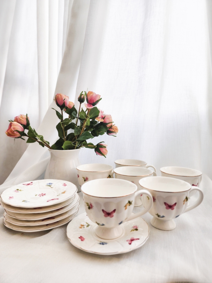طقم فناجين شاي برسمة فراشات ٦ قطع
