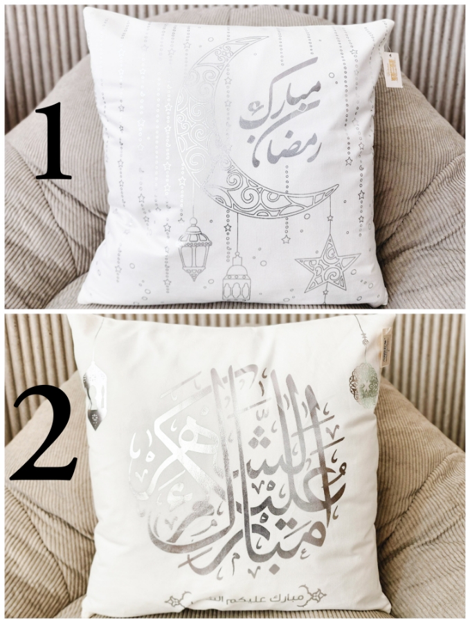 وجه مخدة بكتابات رمضانية باللون الفضي