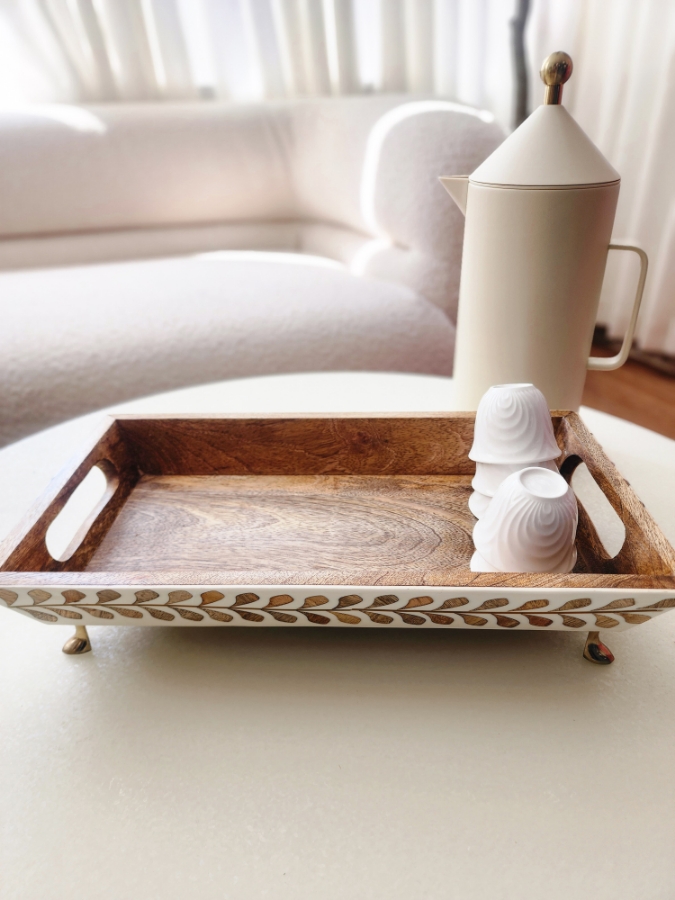 صينية خشبية مستطيلة بنقش ابيض