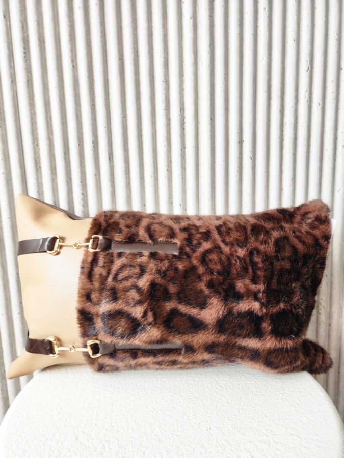 وجه مخدة مستطيل جلد و فرو باللون البني والبيج