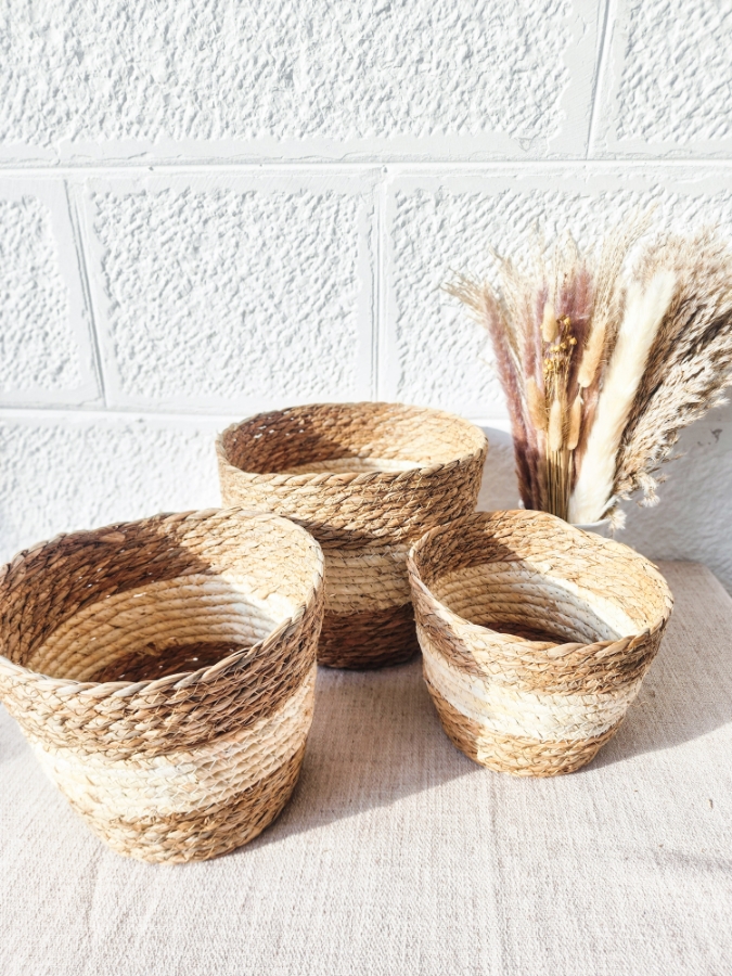 طقم سلات قش ٣ قطع بخطوط بيضاء