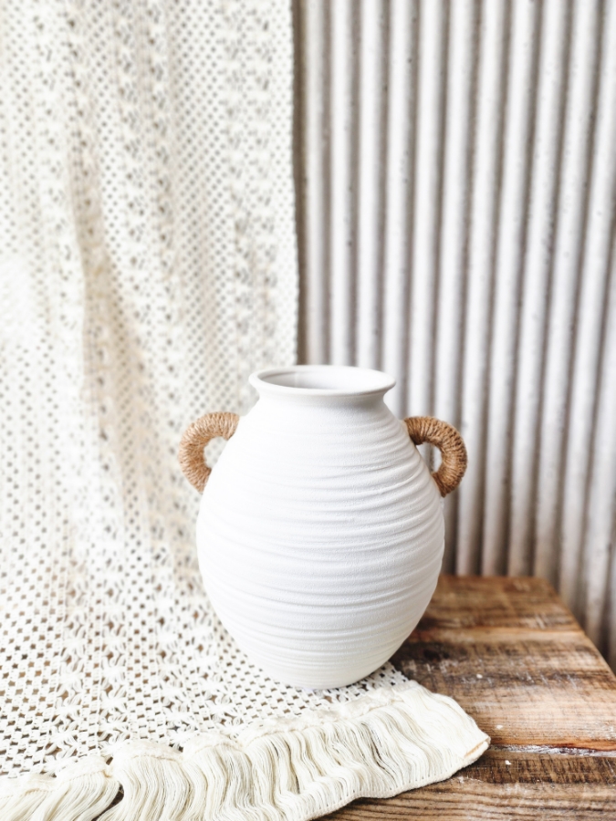 فازة جبصين باللون الابيض مع ايدي بحبال قش
