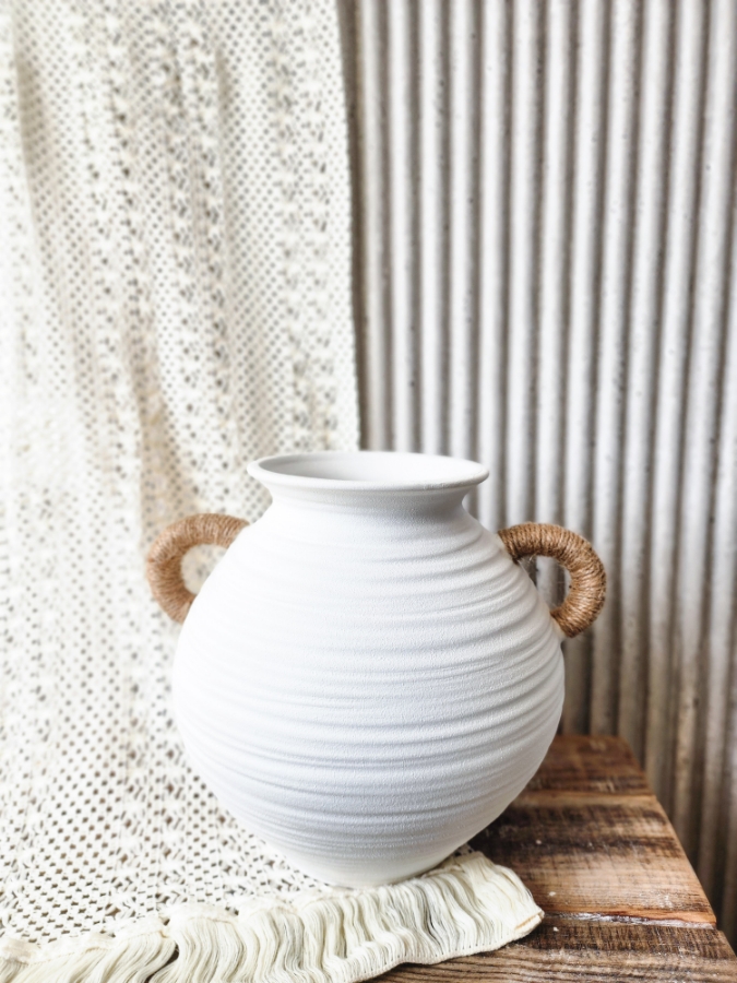 فازة جبصين باللون الابيض مع ايدي بحبال قش