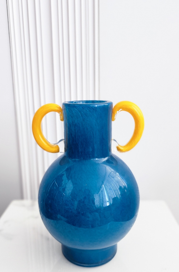 فازة زجاجية باللون الازرق بحلقات برتقالية