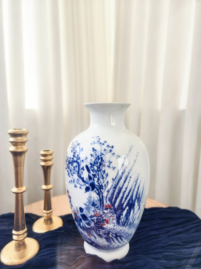 فازة زجاجية مع زخرفة على شكل عصفور باللون الازرق