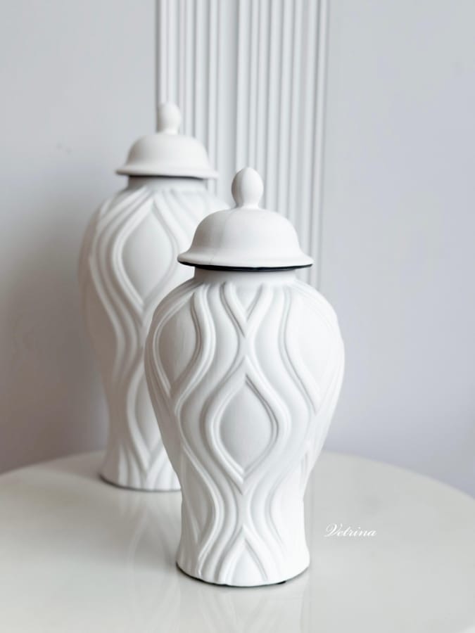 فازة مموجة لون ابيض مع غطاء حجم وسط