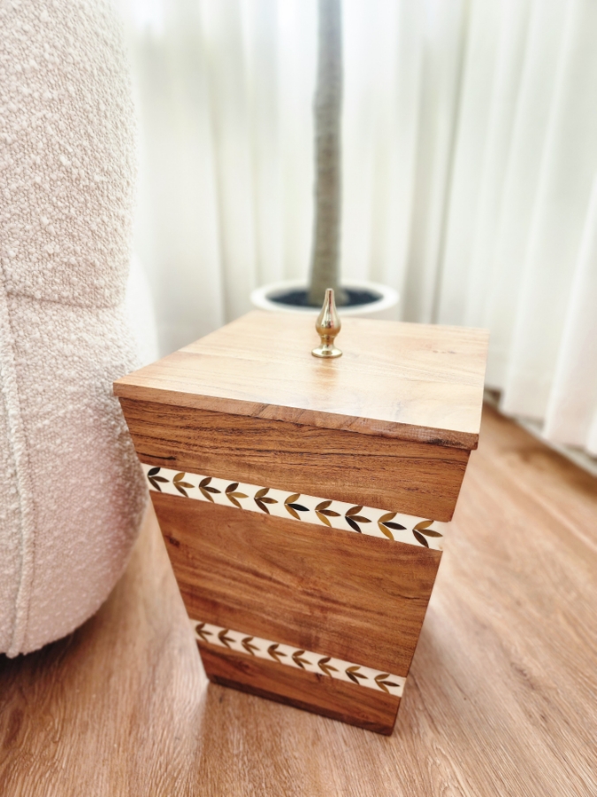 سلة مهملات خشبية منقشة بالابيض مع غطاء