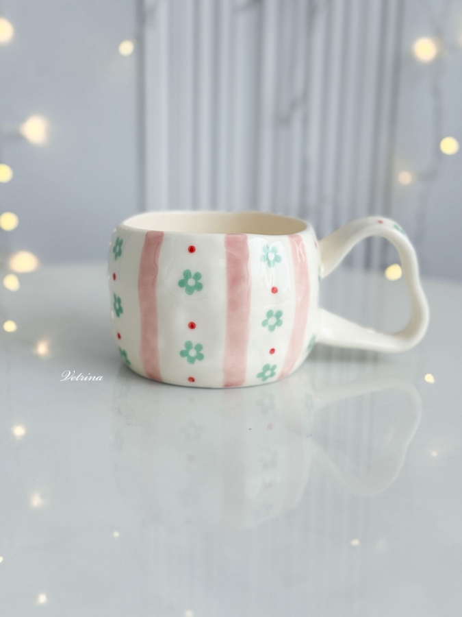 كوب مخطط زهري مع ورود لون اخضر