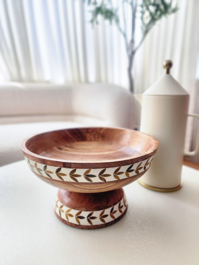 مضيفة خشبية دائرية مع قاعدة مزخرفة بالابيض