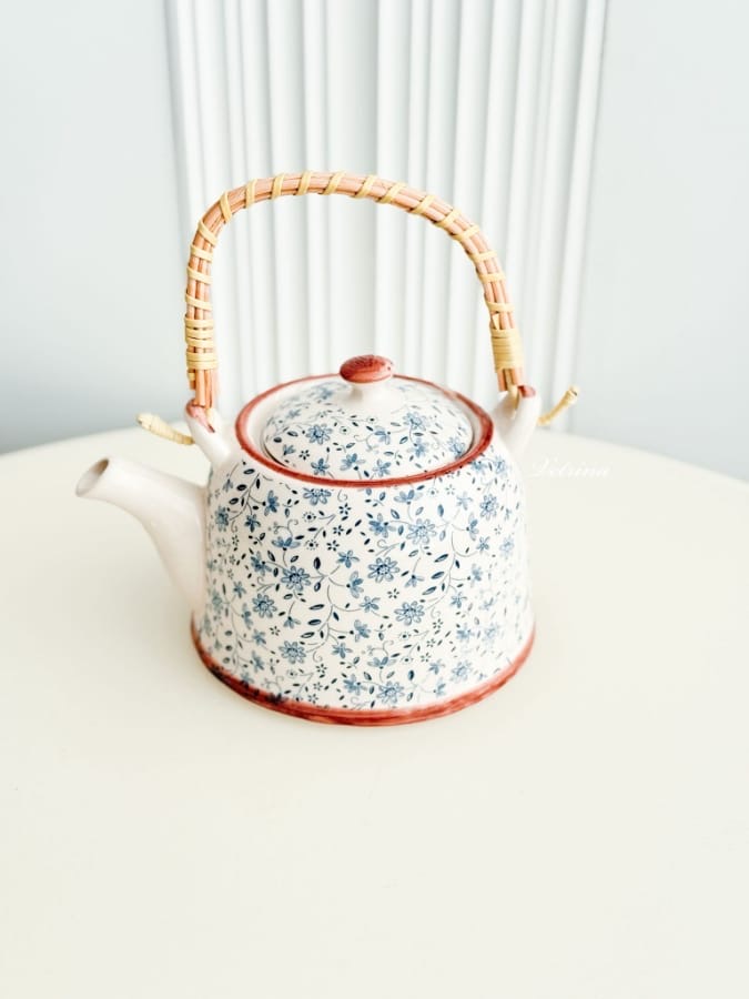 ابريق شاي زجاج تعريقة ازرق ايد خشب مع خيش