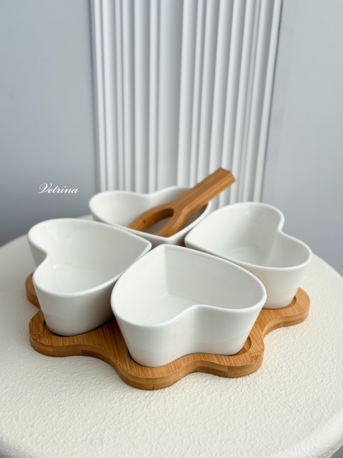 طقم 4 صحون شكل قلوب زجاج مع قاعدة خشب مع معلقة خشب